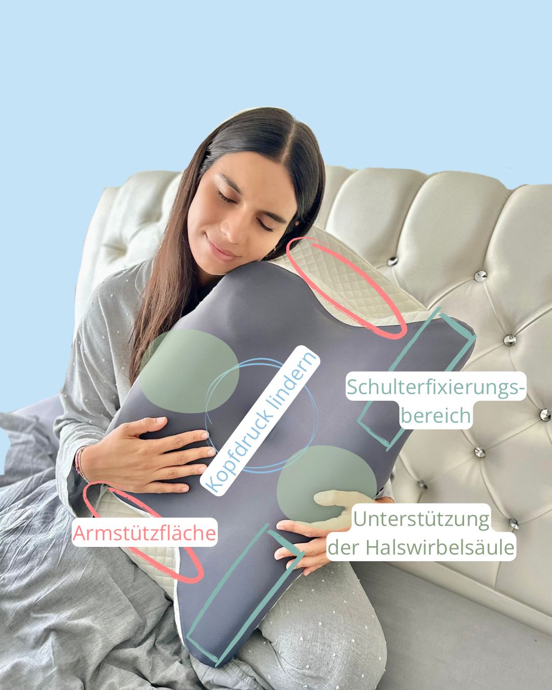 Unser ergonomisch designtes Schmetterlingskissen ist speziell dafür entwickelt, dir unabhängig von deiner bevorzugten Schlafposition maximalen Komfort zu bieten. Es passt sich perfekt an, egal ob du auf dem Rücken, der Seite oder dem Bauch schläfst. Die spezielle Form und der hochwertige Memory-Schaum bieten die nötige Unterstützung für Kopf, Nacken und Schultern und sorgen gleichzeitig für die richtige Ausrichtung deiner Wirbelsäule.